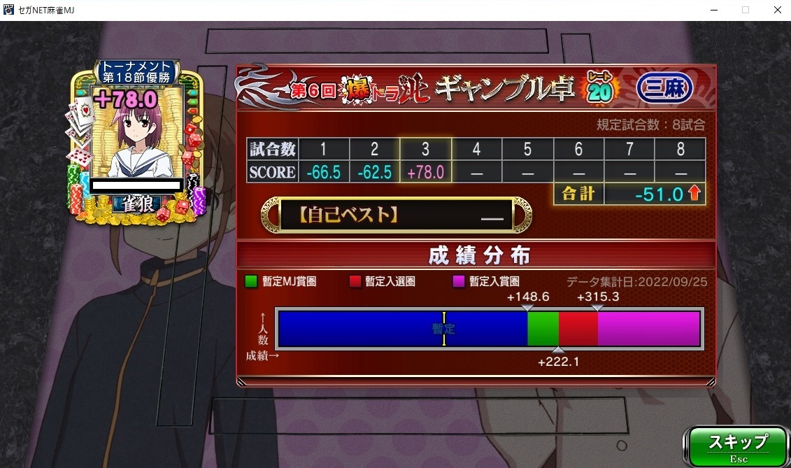 対面さんから七対子ドラドラの9600+2000点を出アガりして、