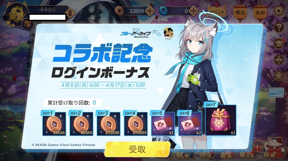 ログインボーナスイベントアイテムを全部もらえることでしょう。